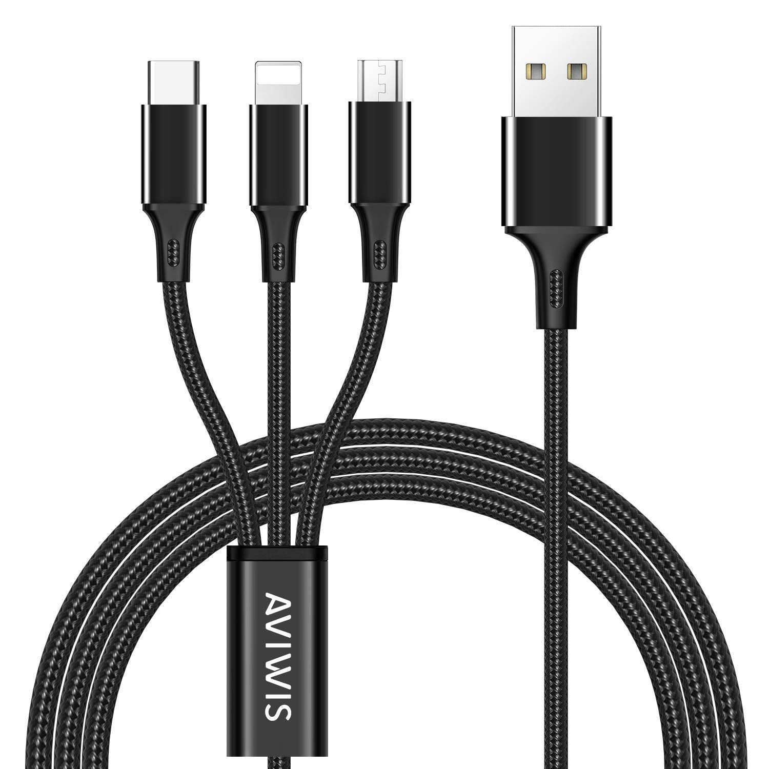 Cable multi-USB 3 en 1 AVIWIS Micro USB, USB type-c, lihgtning tressé 1.2m noir